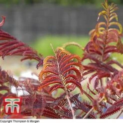 Glorious bronze purple, finely cut foliage of Albizia julibrissin ‘Summer Chocolate’ is accompanied by feathery purple and cream blooms. This magnificent RHS AGM winning, Persian Silk Tree can be grown as a free standing specimen or trained against a sheltered, sunny wall. A handsome tree, hardy to -5°C (23°F), that can be planted in borders outdoors, or grown in a large patio container for a cool conservatory. Height and spread: 6m (19′).