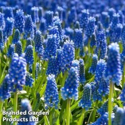 - Muscari armeniacum (85 bulbs) – One of the easiest spring bulbs to grow. Creates a vivid blue carpet of flowers. Perfect for planting in a woodland setting, borders or in pots on your patio. Height: 20cm (8″). Spread: 10cm (4″).
