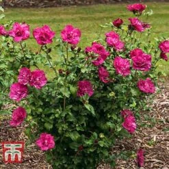 Another variety from the โChiffonโ range, Hibiscus syriacus ‘Magenta Chiffon’, bears large, red-pink blooms that are fully double, resembling old fashioned roses. Lobed foliage covers the upright stems of this deciduous shrub, giving it a pleasing appearance throughout the growing season. Hardy hibiscus make delightful specimen shrubs and bring late summer colour to mixed borders. Their neat upright habit also makes them ideal for planting as part of a hedge or screen. Height: 2.5m (8โ). Spread: 1.5m (5โ).