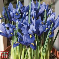 - Iris reticulata ‘Harmony’ – Royal blue petals with a golden yellow streak that make an eye catching combination. Height: 10cm (4″). Spread: 8cm (3″).