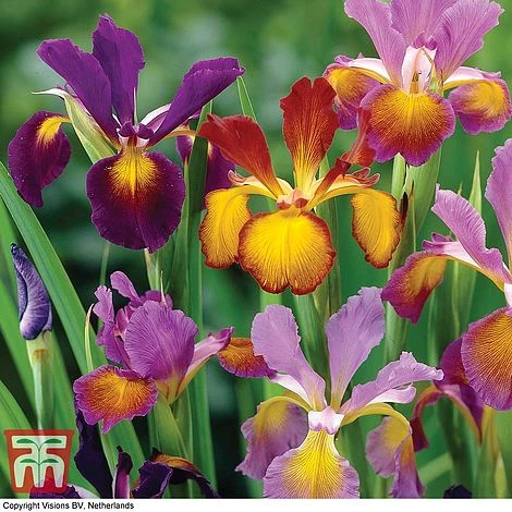 Beautiful, uniquely coloured Dutch Iris in shades of purple and maroon, each petal splashed with yellow. From modern breeding, Iris ‘Metallic Mixture’ is hardy and easy to grow in beds, borders and containers, for a stunning late spring and early summer show. The architectural blooms are borne on strong, straight stems, making superb cut flowers for a vase indoors too. Height: 50cm (20″). Spread: 15cm (6″).