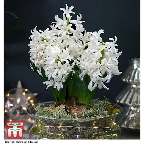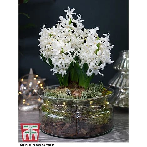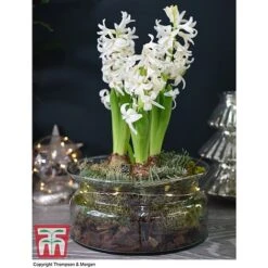 Add some Christmas sparkle to your home with this elegant Hyacinth bowl, complete with it own fairy lights. These perfumed bulbs are a Christmas favourite, filling your home with the fresh scent of spring during the coldest winter months. A trio of gleaming white Hyacinths are gently lit by a festive glow that reflects and twinkles from the clear glass bowl. The perfect choice for your Chrismas table centrepiece or placed in a window to provide a welcoming glow as family arrives for the big day! After flowering, these bulbs can be planted in the garden and enjoyed as an outdoor display.