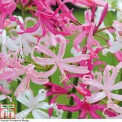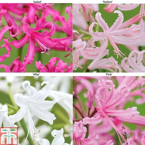 An explosion of colour to rejuvenate tired late-autumn borders! This autumn flowering Nerine bowdenii Collection bears bright blooms on sturdy stems that make dramatic cut flowers at a time when other blooms are scarce. In this collection you will receive the varieties ‘Isabel’, ‘Pink’, ‘Alba’ and ‘Stefani’. These varieties are easy to grow, and produce an impressive display of brightly coloured funnel-shaped blooms. Height: 45cm (18″). Spread: 8cm (3″).