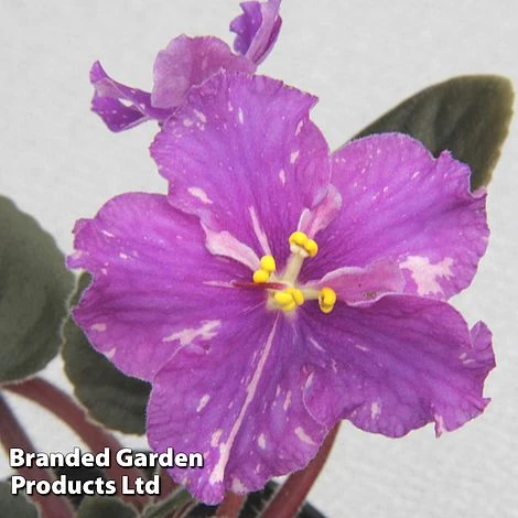 Saintpaulia โAn-Rio Ritaโ bears bright purple petals scattered with pale streaks and splashes.