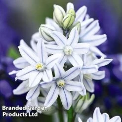 - Russian Snowdrop Puschkinia (Puschkinia libanotica): Gleaming white blooms are produced in dense clusters, each brightly striped with pale blue. Grow them in borders and rockeries or naturalise them in grass. Height: 15cm (6″). Spread: 10cm (4″).