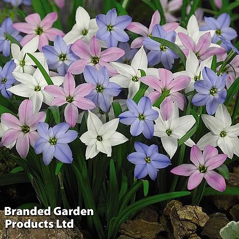 - Ipheion Mix: Clumps of bright green foliage emerge in the autumn followed by an abundance of colourful star-shaped flowers in spring. The flowers have a delightfully sweet honey fragrance. Height: 15cm (6″). Spread: 5cm (2″).