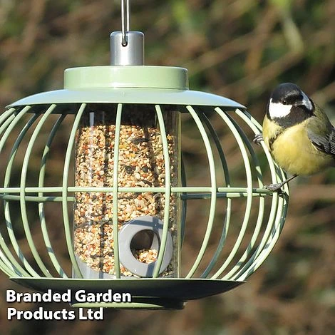 The Nuttery Squirrel-Proof Lantern Seed Feeder features a sturdy, squirrel-proof metal cage surrounding an internal seed feeder. It will attract a wide variety of smaller birds such as Finches, Blue-Tits and Nuthatches whilst preventing larger birds such as pigeons and crows from robbing the food.