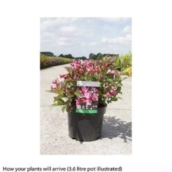 Grown as a dwarf Weigela, ‘Minuet’ provides a spectacular display of rosy-pink trumpet-shape blooms against a backdrop of dark-green, purple-tinged foliage. Its compact habit would fit perfectly in any shrub border or to provide impact on its own in a pot or in the ground. Fully hardy, deciduous shrub that requires a free draining, fertile soil in sun. Height: 1m (3′). Spread: 2m (7′).